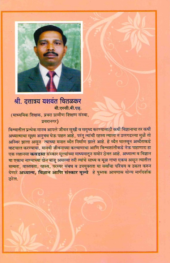 विश्वातील प्रत्येक मानव आपले जीवन सुखी व समृध्द करण्यासाठी कधी विज्ञानाचा तर कधी अध्यात्माचा सूक्ष्म अनुभव घेऊ पाहत आहे, परंतू त्यांची रहस्य त्याला न उलगडल्या मुळे तो अस्थिर झाला असुन त्याच्या मनात व्दैत निर्माण झाले आहे. हे व्दैत घालवून अव्दैताकडे वाटचाल करण्याचा, मानवी जीवनाच्या कल्याणाचा आणि विश्वशांतीकडे नेऊ पाहाणारा हा एक लहानसा कवडसा संस्कार मूल्यांच्या माध्यमातून समोर ठेवत आहे. अध्यात्म व विज्ञान या एकाच नाण्याच्या दोन बाजू असल्या तरी त्यांचे साध्य व मूळ गाभा एकच असून त्यातील सत्यता, वास्तवता, रहस्य, परस्पर संबंध व उपयुक्तता या सर्वांचा परिचय व उकल करुन देणारे अध्यात्म, विज्ञान आणि संस्कार मूल्ये हे पुस्तक आपणास योग्य मार्गदर्शक ठरेल.