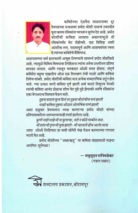 अशा ओळी लिहिणारा हा कवी सोनेरी पंख घेऊन काव्याच्या गगनात भरारी घेत आहे.प्रमोद जोशींच्या “अक्षरऋतू” या कविता संग्रहासाठी माझ्या अगणित शुभेच्छा !