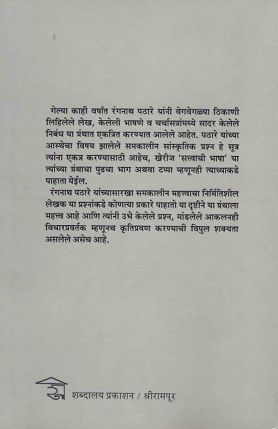 गेल्या काही वर्षांत रंगनाथ पठारे यांनी वेगवेगळ्या ठिकाणी लिहिलेले लेख, केलेली भाषणे व चर्चासत्रांमध्ये सादर केलेले निबंध या ग्रंथात एकत्रित करण्यात आलेले आहेत. पठारे यांच्या आस्थेचा विषय झालेले समकालीन सांस्कृतिक प्रश्न हे सूत्र त्यांना एकत्र करण्यासाठी आहेच, खेरीज ‘सत्त्वाची भाषा’ या त्यांच्या ग्रंथाचा पुढचा भाग अथवा टप्पा म्हणूनही त्याच्याकडे पाहाता येईल.