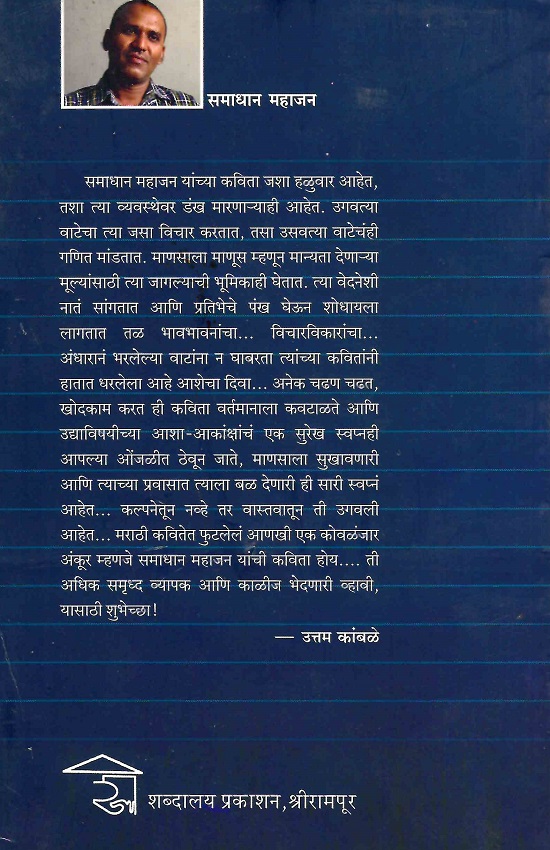 समाधान महाजन यांच्या कविता जशा हळुवार आहेत, तशा त्या व्यवस्थेवर डंख मारणाऱ्याही आहेत. उगवत्या वाटेचा त्या जसा विचार करतात, तसा उसवत्या वाटेचंही गणित मांडतात. माणसाला माणूस म्हणून मान्यता देणाऱ्या मूल्यांसाठी त्या जागल्याची भूमिकाही घेतात. त्या वेदनेशी नातं सांगतात आणि प्रतिभेचे पंख घेऊन शोधायला लागतात तळ भावभावनांचा… विचारविकारांचा… अंधारानं भरलेल्या वाटांना न घाबरता त्यांच्या कवितांनी हातात धरलेला आहे आशेचा दिवा… अनेक चढण चढत, खोदकाम करत ही कविता वर्तमानाला कवटाळते आणि उद्याविषयीच्या आशा-आकांक्षांचं एक सुरेख स्वप्नही आपल्या ओंजळीत ठेवून जाते, माणसाला सुखावणारी आणि त्याच्या प्रवासात त्याला बळ देणारी ही सारी स्वप्नं आहेत… कल्पनेतून नव्हे तर वास्तवातून ती उगवली आहेत… मराठी कवितेत फुटलेलं आणखी एक कोवळंजार अंकूर म्हणजे समाधान महाजन यांची कविता होय. ती अधिक समृध्द व्यापक आणि काळीज भेदणारी व्हावी, यासाठी शुभेच्छा!
