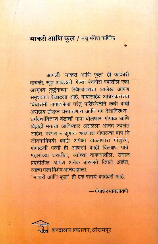 आपली ‘भाकरी आणि फूल’ ही कादंबरी वाचली. खूप आवडली. गेल्या पंचवीस वर्षांतील एका अस्पृश्य कुटुंबाच्या स्थित्यंतराचा आलेख आपण समृध्दपणे रेखाटला आहे. बाबासाहेब आंबेडकरांच्या विचारांनी झपाटलेला परंतु परिस्थितीने कधी कधी असहाय होऊन चरफडणारा आणि मग देशाविरुध्द- धर्मग्रंथांविरुध्द बंडाची भाषा बोलणारा गोपाळ आणि विद्रोही मनाचा आविष्कार असलेला आनंद ज्वलंत आहेत. परंपरा न झुगारू शकणारा गोपाळचा बाप नि जीवनाविषयी काही अपेक्षा बाळगणारा पांडुरंग, गोपाळची पत्नी ही आणखी काही विलक्षण पात्रे. महारांच्या घरातील, त्यांच्या वागण्यातील, समाज प्रवृत्तीतील आपण अनेक बारकावे टिपले आहेत, त्याचा मला विशेष आनंद झाला.’भाकरी आणि फूल’ ही एक समर्थ कादंबरी आहे.