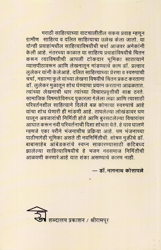 दलित साहित्याच्या प्रेरणा व स्वरुपाची चर्चा, महात्मा फुले यांच्या लेखना विषयीचे चिंतन प्रकट करताना डॉ. लुलेकर मुळातून शोध घेण्याचा प्रयत्न करताना आढळतात. त्यांच्या लेखनाची धार त्यांच्या विचारप्रवृत्तीची साक्ष ठरते. सामाजिक विषमतेविरुध्द पुकारला गेलेला लढा आणि त्यासाठी परिवर्तनशील साहित्याने दिलेले बळ कोणत्या स्वरुपाचे आहे यांचा शोध घेणारी ही मांडणी आहे. तापलेल्या लोखंडावर घण घालून अवजारांची निर्मिती होते आणि बुरसटलेल्या विचारांवर आघात करून नवी परिवर्तनाची दिशा शोधता येते. हे घाव घालणे म्हणजे एका परीने भंजनाचीच प्रक्रिया आहे. पण भंजनाच्या पाठीमागेही भूमिका असते ती नवनिर्मितीची. शोषण मुक्तीचे डॉ. बाबासाहेब आंबेडकरांचे स्वप्न साकारण्यासाठी कटिबध्द झालेल्या साहित्याविषयीचे हे भजन नवसमाज निर्मितीची आळवणी करणारे आहे यात शंका असण्याचे कारण नाही. – डॉ. नागनाथ कोत्तापल्ले