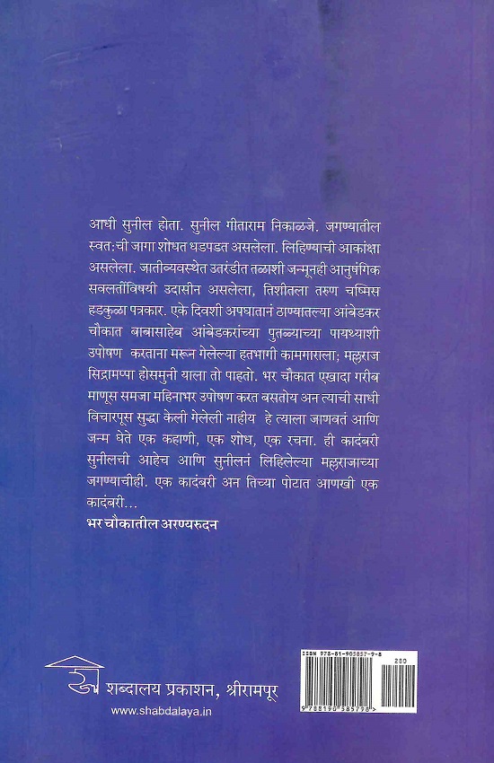 आधी सुनील होता. सुनील गीताराम निकाळजे. जगण्यातील स्वत:ची जागा शोधत धडपडत असलेला. लिहिण्याची आकांक्षा असलेला. जातीव्यवस्थेत उतरंडीत तळाशी जन्मूनही आनुषंगिक सवलतींविषयी उदासीन असलेला, तिशीतला तरुण चष्मिस हडकुळा पत्रकार. एके दिवशी अपघातानं ठाण्यातल्या आंबेडकर चौकात बाबासाहेब आंबेडकरांच्या पुतळ्याच्या पायथ्याशी उपोषण करताना मरून गेलेल्या हतभागी कामगाराला; मल्लराज सिद्रामप्पा होसमुनी याला तो पाहतो. भर चौकात एखादा गरीब माणूस समजा महिनाभर उपोषण करत बसतोय अन त्याची साधी विचारपूस सुद्धा केली गेलेली नाहीय हे त्याला जाणवतं आणि जन्म घेते एक कहाणी, एक शोध, एक रचना. ही कादंबरी सुनीलची आहेच आणि सुनीलनं लिहिलेल्या मल्लराजाच्या जगण्याचीही. एक कादंबरी अन तिच्या पोटात आणखी एक कादंबरी….
