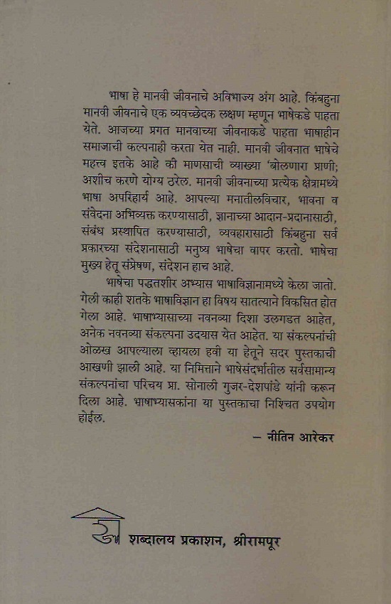 भाषेचा पद्धतशीर अभ्यास भाषाविज्ञानामध्ये केला जातो. गेली काही शतके भाषाविज्ञान हा विषय सातत्याने विकसित होत गेला आहे. भाषाभ्यासाच्या नवनव्या दिशा उलगडत आहेत, अनेक नवनव्या संकल्पना उदयास येत आहेत. या संकल्पनांची ओळख आपल्याला व्हायला हवी या हेतूने सदर पुस्तकाची आखणी झाली आहे. या निमित्ताने भाषेसंदर्भातील सर्वसामान्य संकल्पनांचा परिचय प्रा. सोनाली गुजर-देशपांडे यांनी करून दिला आहे. भाषाभ्यासकांना या पुस्तकाचा निश्चित उपयोग होईल.