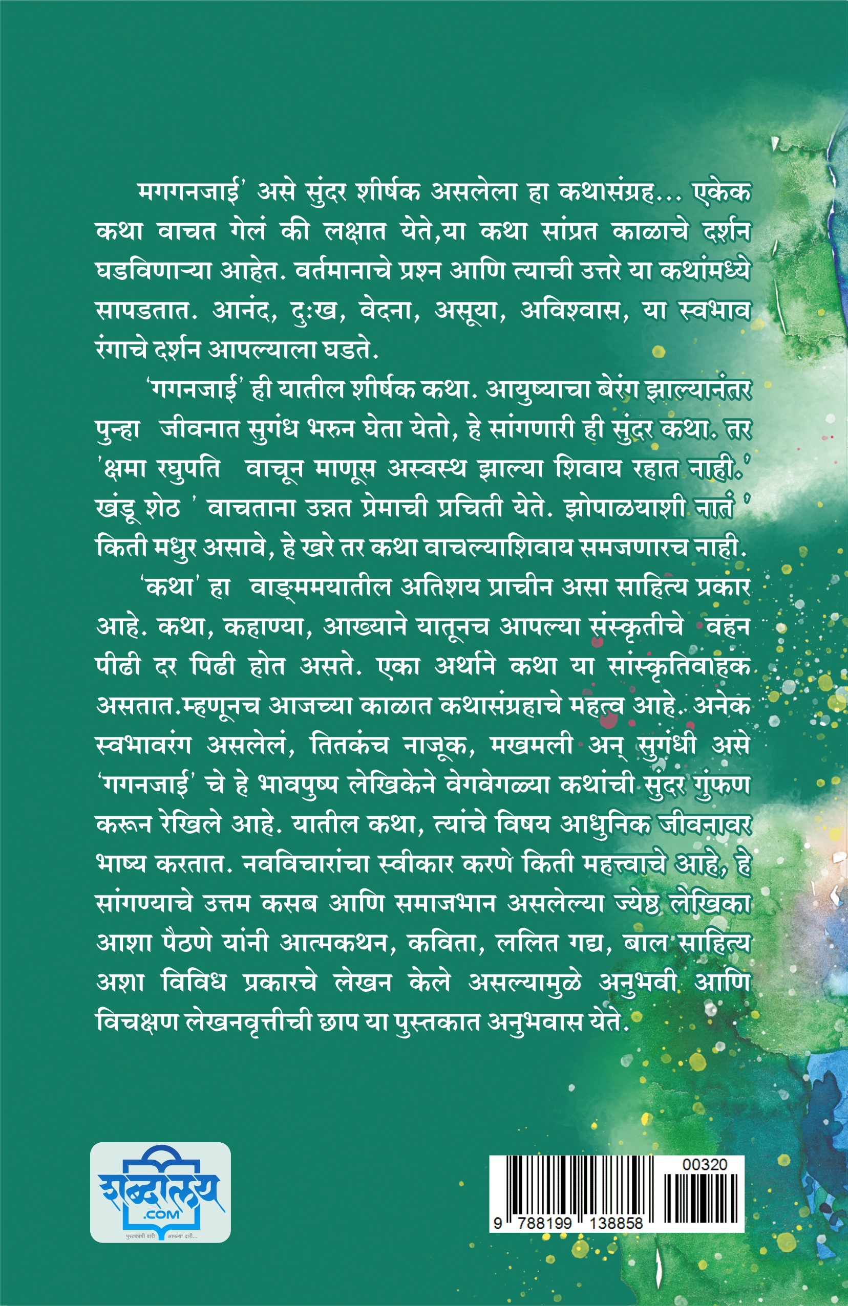 मगगनजाई’ असे सुंदर शीर्षक असलेला हा कथासंग्रह… एकेक कथा वाचत गेलं की लक्षात येते, या कथा सांप्रत काळाचे दर्शन घडविणाऱ्या आहेत. वर्तमानाचे प्रश्न आणि त्याची उत्तरे या कथांमध्ये सापडतात. आनंद, दुःख, वेदना, असूया, अविश्वास, या स्वभाव रंगाचे दर्शन आपल्याला घडते.