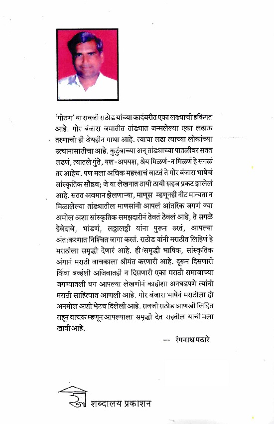 ‘गोठण’ या रावजी राठोड यांच्या कादंबरीत एका लढ्याची हकिगत आहे. गोर बंजारा जमातीत तांड्यात जन्मलेल्या एका लढाऊ तरुणाची ही श्रेयहीन गाथा आहे. त्याचा लढा त्याच्या लोकांच्या उत्थानासाठीचा आहे. कुटुंबाच्या अन् तांड्याच्या पातळीवर सतत लढणं, त्यातले गुंते, यश-अपयश, श्रेय मिळणं न मिळणं हे सगळं तर आहेच. पण मला अधिक महत्त्वाचं वाटतं ते गोर बंजारा भाषेचं सांस्कृतिक सौष्ठव; जे या लेखनात ठायी ठायी सहज प्रकट झालेलं आहे. सतत अवमान झेलणाऱ्या, माणूस म्हणूनही नीट मान्यता न मिळालेल्या तांड्यातील माणसांनी आपलं आंतरिक जगणं ज्या अमोल अशा सांस्कृतिक समझदारीनं तेवतं ठेवलं आहे, ते सगळे हेवेदावे, भांडणं, लठ्ठालठ्ठी यांना पुरून उरतं, आपल्या अंतःकरणात निश्चित जागा करतं. राठोड यांनी मराठीत लिहिणं हे मराठीला समृद्धी देणारं आहे. ही समृद्धी भाषिक, सांस्कृतिक अंगानं मराठी वाचकाला श्रीमंत करणारी आहे. दूरून दिसणारी किंवा बव्हंशी अजिबातही न दिसणारी एका मराठी समाजाच्या जगण्यातली धग आपल्या लेखणीनं काहीशा अनघडपणे त्यांनी मराठी साहित्यात आणली आहे. गोर बंजारा भाषेनं मराठीला ही अनमोल अशी भेटच दिलेली आहे. रावजी राठोड आणखी लिहित राहून वाचक म्हणून आपल्याला समृद्धी देत राहतील याची मला खात्री आहे.