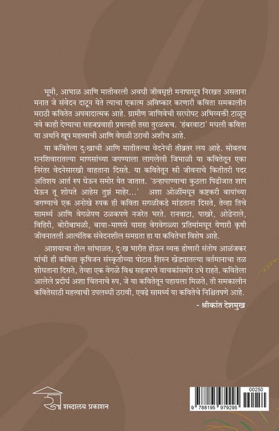 भूमी, आभाळ आणि मातीवरली अवघी जीवसृष्टी मनापासून निरखत असताना मनात जे संवेदन दाटून येते त्याचा एकात्म अविष्कार करणारी कविता समकालीन मराठी कवितेत अपवादात्मक आहे. ग्रामीण जाणिवेची सरधोपट अभिव्यक्ती टाळून नवे काही देण्याचा सहजप्रवाही प्रयत्नही तसा तुरळकच. ‘हंवरवाटा’ मधली कविता या अर्थाने खूप महत्त्वाची आणि वेगळी ठरावी अशीच आहे.या कवितेला दुःखाची आणि मातीतल्या वेदनेची तीव्रतर लय आहे. सोबतच रानशिवारातल्या माणसांच्या जगण्याला लागलेली जिभाळी या कवितेतून एका निरंतर वेदनेसारखी वाहताना दिसते. या कवितेतून खी जीवनाचे कितीतरी पदर अतिशय आर्त रुप घेऊन समोर येत जातात. ‘उन्हापाण्याचा कुठला पिढीजात शाप घेऊन तू. शोधते आहेस तुझं माहेर…’ अशा ओळींमधून कष्टकरी बायांच्या जगण्याचे एक अनोखो रुपक ही कविता सगळीकडे मांडताना दिसते, तेव्हा तिचे सामर्थ्य आणि वेगळेपण ठळकपणे नजरेत भरते. रानवाटा, पाखरे, ओडेनाले, विहिरी, बोरीबाभळी, बाया माणसे यासह वेगवेगळ्या प्रतिमांमधून येणारी कृषी जोवनातली आत्यंतिक संवेदनशील समग्रता हा या कवितेचा विशेष आहे. आशयाचा तोल सांभाळत, दुःख भारीत होऊन व्यक्त होणारी संतोष आळंजकर यांची ही कविता कृषिजन संस्कृतीच्या पोटात शिस्न खेड्यातल्या वर्तमानाचा तळ शोधताना दिसते, तेव्हा एक वेगळे विश्व सहजपणे वाचकांसमोर उभे राहते. कवितेला आलेले प्रदीर्घ अशा चिंतनाचे रुप, जे या कवितेतून पहायला मिळते, ती समकालीन कवितेसाठी महत्वाची उपलब्धी ठरावी, एवढे सामर्थ्य या कवितेचे निश्चितपणे आहे.- श्रीकांत देशमुख
