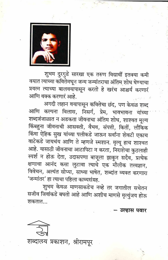 शुभम दुरगुडे सारखा एक तरुण विद्यार्थी इतक्या कमी वयात त्याच्या कवितेमधून जन्म जन्मांतराचा अंतिम शोध घेण्याचा प्रयत्न त्याच्या बालवयापासून करतो हे खरंच आश्चर्य करणारं आणि थक्क करणारं आहे. अगदी लहान वयापासून कवितेचा छंद, पण केवळ शब्द आणि कल्पना विलास, निसर्ग, प्रेम, भावभावना यांच्या शब्दजंजाळात न अडकता जीवनाचा अंतिम शोध, शाश्वत मूल्य किंबहुना जीवनाची आसक्ती, वैभव, संपत्ती, किर्ती, लौकिक किंवा ऐहिक सुख यांच्या पलीकडे जाऊन सर्वांना शेवटी एकाच वाटेकडे जायचंय आणि ते म्हणजे स्मशान. मृत्यू हाच शाश्वत आहे. यासाठी जीवनाचा आटापिटा न करता, निराशेचा कुठलाही स्पर्श न होऊ देता, उदासपणा बाजूला झाकून सदैव, प्रत्येक क्षणाचा आनंद कसा लुटावा त्याचे एक मौलीक तत्त्वज्ञान, विवेचन, अत्यंत सोप्या, साध्या भाषेत, शब्दांत व्यक्त करणारा ‘जन्मांतर’ हा त्याचा पहिला काव्यसंग्रह. शुभम केवळ माणसाकडेच नव्हे तर जगातील सचेतन सजीव जिवांकडे बघतो आहे आणि अशीच माणसे मृत्युंजय होऊ शकतात…