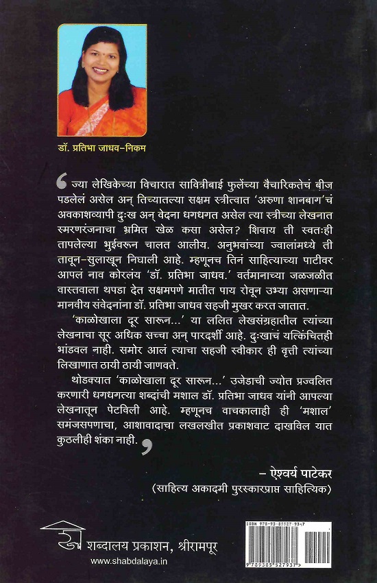 ज्या लेखिकेच्या विचारात सावित्रीबाई फुलेंच्या वैचारिकतेचं बीज पडलेलं असेल अन् तिच्यातल्या सक्षम स्त्रीत्वात ‘अरुणा शानबाग’ चं अवकाशव्यापी दुःख अन् वेदना धगधगत असेल त्या स्त्रीच्या लेखनात स्मरणरंजनाचा भ्रमित खेळ कसा असेल? शिवाय ती स्वतःही तापलेल्या भुईवरून चालत आलीय. अनुभवांच्या ज्वालांमध्ये ती तावून-सुलाखून निघाली आहे. म्हणूनच तिनं साहित्याच्या पाटीवर आपलं नाव कोरलंय ‘ डॉ. प्रतिभा जाधव.’ वर्तमानाच्या जळजळीत वास्तवाला थपडा देत सक्षमपणे मातीत पाय रोवून उभ्या असणाऱ्या मानवीय संवेदनांना डॉ. प्रतिभा जाधव सहजी मुखर करत जातात. ‘काळोखाला दूर सारून…’ या ललित लेखसंग्रहातील त्यांच्या लेखनाचा सूर अधिक सच्चा अन् पारदर्शी आहे. दुःखाचं यत्किंचितही भांडवल नाही. समोर आलं त्याचा सहजी स्वीकार ही वृत्ती त्यांच्या लिखाणात ठायी ठायी जाणवते. थोडक्यात ‘काळोखाला दूर सारून…’ उजेडाची ज्योत प्रज्वलित करणारी धगधगत्या शब्दांची मशाल डॉ. प्रतिभा जाधव यांनी आपल्या लेखनातून पेटविली आहे. म्हणूनच वाचकालाही ही ‘मशाल’ समंजसपणाचा, आशावादाचा लखलखीत प्रकाशवाट दाखविल यात कुठलीही शंका नाही.