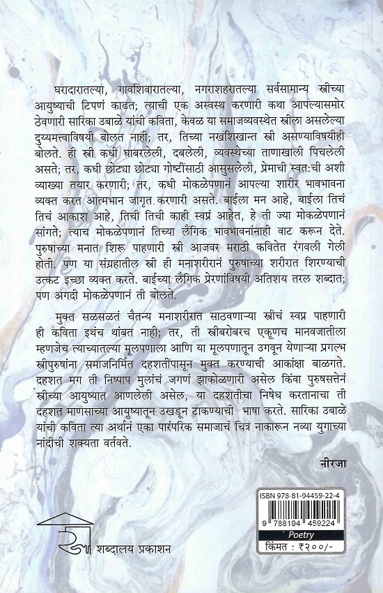 पुरुषाच्या मनात शिरू पाहणारी स्त्री आजवर मराठी कवितेत रंगवली गेली होती. पण या संग्रहातील स्त्री ही मनाशरीरानं पुरुषाच्या शरीरात शिरण्याची उत्कट इच्छा व्यक्त करते. बाईच्या लैंगिक प्रेरणांविषयी अतिशय तरल शब्दात; पण अगदी मोकळेपणानं ती बोलते. मुक्त सळसळतं चैतन्य मनाशरीरात साठवणाऱ्या स्त्रीचं स्वप्न पाहणारी ही कविता इथंच थांबत नाही; तर, ती स्त्रीबरोबरच एकूणच मानवजातीला म्हणजेच त्याच्यातल्या मूलपणाला आणि या मूलपणातून उगवून येणाऱ्या प्रगल्भ स्त्रीपुरुषांना समाजनिर्मित दहशतींपासून मुक्त करण्याची आकांक्षा बाळगते. दहशत मग ती निष्पाप मुलांचं जगणं झाकोळणारी असेल किंवा पुरुषसत्तेनं स्त्रीच्या आयुष्यात आणलेली असेल, या दहशतीचा निषेध करतानाचा ती दहशत माणसाच्या आयुष्यातून उखडून टाकण्याची भाषा करते. सारिका उबाळे यांची कविता त्या अर्थानं एका पारंपरिक समाजाचं चित्र नाकारून नव्या युगाच्या नांदीची शक्यता वर्तवते.