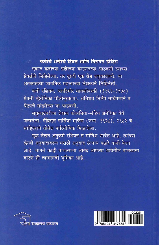 कवीचे अखेरचे दिवस आणि निरागस इरेंदिरा एकात कवीच्या अखेरच्या काळातल्या आठवणी त्याच्या प्रेयसीने लिहिलेल्या. तर दुसरी एक श्रेष्ठ लघुकादंबरी. या शतकातल्या जागतिक महत्त्वाच्या लेखकाने लिहिलेली. कवी रशियन ब्लादिमीर मायकोवस्की (१९९३-१९३०) प्रेयसी व्हेरोनिका पोलोन्स्काया. अतिशय निर्लेप साधेपणाने व थेटपणे मांडलेल्या या आठवणी. लघुकादंबरीचा लेखक कोलंबिया – लॅटिन अमेरिका येथे जन्मलेला. गॅब्रिएल गार्सिया मार्केझ (जन्म: १९२८), १९८२ चे साहित्याचे नोबेल पारितोषिक मिळालेला. मूळ लेखन अनुक्रमे रशियन व स्पॅनिश भाषेत आहे. त्यांच्या इंग्रजी अनुवादावरून मराठी अनुवाद रंगनाथ पठारे यांनी केला आहे. चांगले काही वाचल्याचा आनंद आपल्या भाषेतील वाचकांना वाटणे ही त्यामागची भूमिका आहे.