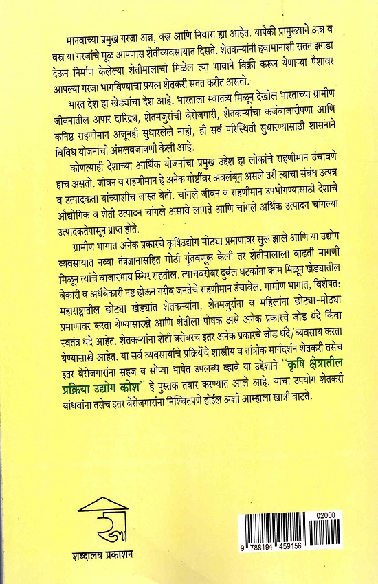 ग्रामीण भागात अनेक प्रकारचे कृषिउद्योग मोठ्या प्रमाणावर सुरू झाले आणि या उद्योग व्यवसायात नव्या तंत्रज्ञानासहित मोठी गुंतवणूक केली तर शेतीमालाला वाढती मागणी मिळून त्यांचे बाजारभाव स्थिर राहतील. त्याचबरोबर दुर्बल घटकांना काम मिळून खेड्यातील बेकारी व अर्धबेकारी नष्ट होऊन गरीब जनतेचे राहणीमान उंचावेल. गामीण भागात, विशेषत: महाराष्ट्रातील छोट्या खेड्यांत शेतकऱ्यांना, शेतमजुरांना व महिलांना छोट्या-मोठ्या प्रमाणावर करता येण्यासारखे आणि शेतीला पोषक असे अनेक प्रकारचे जोड धंदे किंवा स्वतंत्र धंदे आहेत. शेतकऱ्यांना शेती बरोबरच इतर अनेक प्रकारचे जोड धंदे / व्यवसाय करता येण्यासारखे आहेत. या सर्व व्यवसायांचे प्रक्रियेंचे शास्त्रीय व तांत्रीक मार्गदर्शन शेतकरी तसेच इतर बेरोजगारांना सहज व सोप्या भाषेत उपलब्ध व्हावे या उद्देशाने “कृषि क्षेत्रातील प्रक्रिया उद्योग कोश” हे पुस्तक तयार करण्यात आले आहे. याचा उपयोग शेतकरी बांधवांना तसेच इतर बेरोजगारांना निश्चितपणे होईल अशी आम्हाला खात्री वाटते.