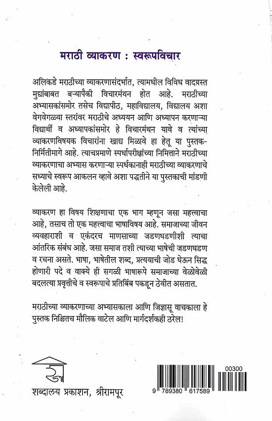 व्याकरण हा विषय शिक्षणाचा एक भाग म्हणून जसा महत्त्वाचा आहे, तसाच तो एक महत्त्वाचा भाषाविषय आहे. समाजाच्या जीवन व्यवहाराशी व एकंदरच माणसाच्या जडणघडणीशी त्याचा आंतरिक संबंध आहे. जसा समाज तशी त्याच्या भाषेची जडणघडण व रचना असते. भाषा, भाषेतील शब्द, प्रत्ययाची जोड घेऊन सिद्ध होणारी पदे व वाक्ये ही सगळी भाषारूपे समाजाच्या वेळोवेळी बदलत्या प्रवृत्तीचे व स्वरूपाचे प्रतिबिंब पकडून ठेवीत असतात. मराठीच्या व्याकरणाच्या अभ्यासकाला आणि जिज्ञासू वाचकाला हे पुस्तक निश्चितच मौलिक वाटेल आणि मार्गदर्शकही ठरेल!