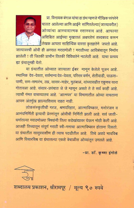 प्रा. विनायक बंगाळ यांचा हा ग्रंथ म्हणजे मौखिक परंपरेने चालत आलेल्या आणि आईने सांगितलेल्या ( जात्यावरील) ओव्यांचा आस्वादात्मक रसास्वाद आहे. आपल्या अशिक्षित आईच्या मुखातलं अक्षरलेणं शब्दबध्द करून लेखक आपला साहित्यिक वारसा कृतज्ञतेने जपतो आहे. जात्यावरची ओवी ही अस्सल मराठमोळी ! मराठीच्या आदिबंधातून निर्माण झालेली ! ती जितकी प्राचीन तितकी विविधतेने नटलेली आहे. याचा प्रत्यय ह्या ग्रंथातूनही येतो. या ग्रंथातील ओव्यात जात्याला ईश्वर मानून केलेले पूजन आहे.. स्थानिक देव-देवता, सर्वमान्य देव-देवता, परिसर वर्णन, शेतीवाडी, पाऊस- पाणी, सण-समारंभ, लग्न, सासर-माहेर, मुलंबाळं, यांच्यासहीत एकूणच सारा गोतावळा आहे. संसार – प्रपंचात जे जे म्हणून असते ते ते सर्व काही आहे. त्याची गंमत वाचण्यातच आहे. ‘आत्मपर’ या विभागातील ओव्या वाचताना आपण अंतर्मुख झाल्याशिवाय राहत नाही. लोकसंस्कृतीची गरज, श्रमपरिहार, आत्माविष्कार, मनोरंजन व आनंदनिर्मिती इत्यादी प्रेरणांतून ओवीची निर्मिती झाली आहे. सर्व जाती- धर्मातल्या मराठमोळ्या स्त्रियांनी तिला कडेखांद्यावर घेऊन मोठी केली आहे. आजही तिच्यातून संपूर्ण मराठी स्त्री-मनाचा आत्माविष्कार होताना दिसतो. या ग्रंथातील सासुरवाशीण ही त्याच पठडीतील आहे. तिचे अवघे भावविश्व आणि विचारविश्व या ग्रंथातल्या एकशे त्रेचाळीस ओव्यांतून उमलले आहे.