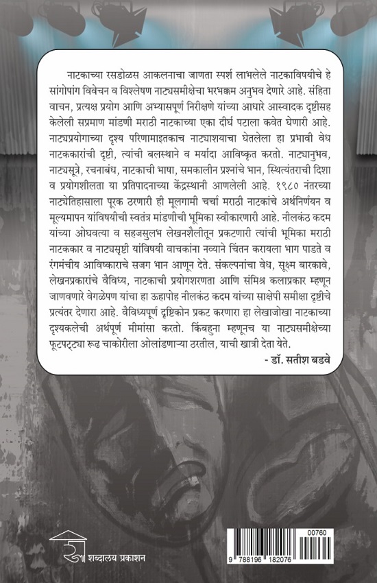 नाटकाच्या रसडोळस आकलनाचा जाणता स्पर्श लाभलेले नाटकाविषयीचे हे सांगोपांग विवेचन व विश्लेषण नाट्यसमीक्षेचा भरभक्कम अनुभव देणारे आहे. संहिता वाचन, प्रत्यक्ष प्रयोग आणि अभ्यासपूर्ण निरीक्षणे यांच्या आधारे आस्वादक दृष्टीसह केलेली सप्रमाण मांडणी मराठी नाटकाच्या एका दीर्घ पटाला कवेत घेणारी आहे. नाट्यप्रयोगाच्या दृश्य परिणामाइतकाच नाट्याशयाचा घेतलेला हा प्रभावी वेध नाटककारांची दृष्टी त्यांची बलस्थाने व मर्यादा आविष्कृत करतो. नाट्यानुभव, नाट्यसूत्रे, रचनाबंध, नाटकाची भाषा, समकालीन प्रश्नांचे भान, स्थित्यंतराची दिशा व प्रयोगशीलता या प्रतिपादनाच्या केंद्रस्थानी आणलेली आहे.