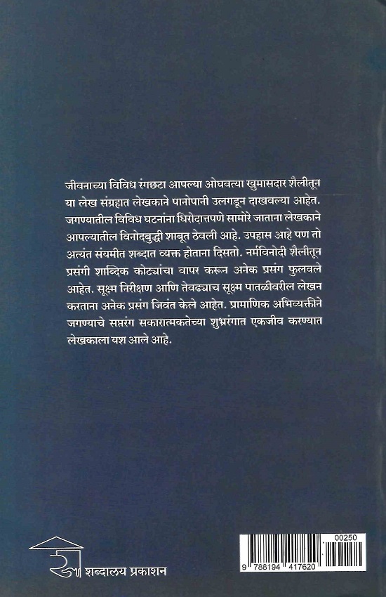 जीवनाच्या विविध रंगछटा आपल्या ओघवत्या खुमासदार शैलीतून या लेख संग्रहात लेखकाने पानोपानी उलगडून दाखवल्या आहेत. जगण्यातील विविध घटनांना धिरोदात्तपणे सामोरे जाताना लेखकाने आपल्यातील विनोदबुद्धी शाबूत ठेवली आहे. उपहास आहे पण तो अत्यंत संयमीत शब्दात व्यक्त होताना दिसतो. नर्मविनोदी शैलीतून प्रसंगी शाब्दिक कोट्यांचा वापर करून अनेक प्रसंग फुलवले आहेत. सूक्ष्म निरीक्षण आणि तेवढ्याच सूक्ष्म पातळीवरील लेखन करताना अनेक प्रसंग जिवंत केले आहेत. प्रामाणिक अभिव्यक्तीने जगण्याचे सप्तरंग सकारात्मकतेच्या शुभ्ररंगात एकजीव करण्यात लेखकाला यश आले आहे.