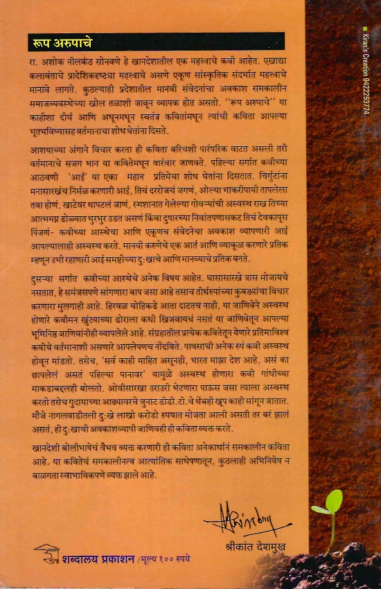 रा. अशोक नीलकंठ सोनवणे हे खानदेशातील एक महत्वाचे कवी आहेत. एखाद्या कलावंताचे प्रादेशिकदृष्ट्या महत्त्वाचे असणे एकूण सांस्कृतिक संदर्भात महत्त्वाचे मानावे लागते. कुठल्याही प्रदेशातील मानवी संवेदनांचा अवकाश समकालीन समाजव्यवस्थेच्या खोल तळाशी जावून व्यापक होत असतो. “रूप अरुपाचे” या काहीशा दीर्घ आणि अधूनमधून स्वतंत्र कवितांमधून त्यांची कविता आपल्या भूतभविष्यासह वर्तमानाचा शोध घेतांना दिसते. आशयाच्या अंगाने विचार करता ही कविता बरिचशी पारंपरिक वाटत असली तरी वर्तमानाचे सजग भान या कवितेमधून वारंवार जाणवते. पहिल्या सर्गात कवीच्या आठवणी ‘आई’ या एका महान प्रतिमेचा शोध घेतांना दिसतात. चिगुंटांना मनासारखंच निर्मळ करणारी आई, तिचं दररोजचं जगणं, ओल्या भाकरीपायी तापलेला तवा होणं, खाटेवर थापटलं जाणं, स्मशानात गेलेल्या गोवऱ्यांची अस्वस्थ राख तिच्या आत्ममग्न डोळ्यात भुरभुर उडत असणं किंवा दुपारच्या निवांतपणासकट तिचं देवकापूस पिंजणं- कवीच्या आस्थेचा आणि एकूणच संवेदनेचा अवकाश व्यापणारी आई आपल्यालाही अस्वस्थ करते. मानवी करुणेचे एक आर्त आणि व्याकूळ करणारे प्रतिक म्हणून उभी रहाणारी आई समष्टीच्या दुःखाचे आणि मानव्याचे प्रतिक बनते. दुसऱ्या सर्गात कवीच्या आस्थेचे अनेक विषय आहेत. घासासारखे त्रास मोजायचे नसतात, हे समंजसपणे सांगणारा बाप जसा आहे तसाच तीर्थरुपांच्या कुबड्यांचा विचार करणारा मुलगाही आहे. हिरवळ चोहिकडे आता दाटतच नाही, या जाणिवेने अस्वस्थ होणारे कवीमन खुंटयाच्या ढोराला कधी खिजवायचं नसतं या जाणिवेतून आपल्या भूमिनिष्ठ जाणिवांनीही व्यापलेले आहे. संग्रहातील प्रत्येक कवितेतून येणारे प्रतिमाविश्व कवीचे वर्तमानाशी असणारे आपलेपणच नोंदविते. पावसाची अनेक रुपं कवी अस्वस्थ होवून मांडतो. तसेच, ‘सर्व काही माहित असूनही, भारत माझा देश आहे, असं का छापलेलं असतं पहिल्या पानावर यामुळे अस्वस्थ होणारा कवी गांधीच्या माकडाबद्दलही बोलतो. ओवीसारखा उराउरी भेटणारा पाऊस जसा त्याला अस्वस्थ करतो तसेच गुदामाच्या आल्यावरचे जुनाट डीडी. टी. चे थेंबही खूप काही सांगून जातात. मौजे नागलवाडीतली दुःखे लाखो करोडो रुपयात मोजता आली असती तर बरं झालं असतं, ही दुःखाची अवकाशव्यापी जाणिवही ही कविता व्यक्त करते. खानदेशी बोलीभाषेचं वैभव व्यक्त करणारी ही कविता अनेकार्थानं समकालीन कविता आहे. या कवितेचं समकालीनत्व आत्यांतिक साधेपणातून, कुठलाही अभिनिवेष न बाळगता स्वाभाविकपणे व्यक्त झाले आहे.