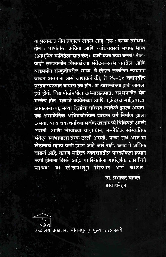 या पुस्तकात तीन प्रकारचं लेखन आहे. एक : काव्य समीक्षा; दोन : भाषांतरित कविता आणि त्यांच्यावरलं सूचक भाष्य (आधुनिक कवितेला सात छेद), कवी काय काम करतो; तीन : काही समकालीन लेखकांच्या संवेदन- स्वभावावरील आणि वाड़मयीन संस्कृतीवरील भाष्य. हे लेखन संकलित स्वरुपात वाचत असताना असं जाणवलं की, ते २५-३० वर्षापूर्वीच पुस्तकस्वरुपात यायला हवं होतं. अभ्यासकांच्या हाती जायला हवं होतं, विद्यापीठांमधील अभ्यासक्रमात, संदर्भयादीत येणं गरजेचं होतं. म्हणजे कवितेच्या आणि एकंदरच साहित्याच्या आकलनाच्या, नव्या दिशांचा परिचय त्यावेळी झाला असता. एक असांकेतिक अभिरुचीसंपन्न वाचक वर्ग निर्माण झाला असता. या वाचक वर्गाच्या सर्जक उद्देशांमध्ये विविधता आली असती. आणि लेखांच्या वाड़मयीन, न-नैतिक सांस्कृतिक संवेदन स्वभावाला प्रेरक ठरली असती. याचा अर्थ आज या लेखनाचं महत्त्व कमी झालं आहे असं नाही. उलट ते अधिक वाढलं आहे. कारण साहित्य व्यवहारातील पारदर्शकता क्रमानं कमी होताना दिसते आहे. या स्थितीला मार्गदर्शक उत्तर चित्रे यांच्या या लेखनातून मिळेल असं वाटतं.