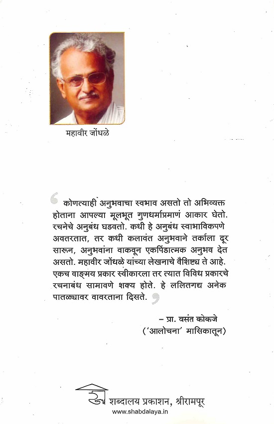 कोणत्याही अनुभवाचा स्वभाव असतो तो अभिव्यक्त होताना आपल्या मूलभूत गुणधर्माप्रमाणं आकार घेतो. रचनेचे अनुबंध घडवतो. कधी हे अनुबंध स्वाभाविकपणे अवतरतात, तर कधी कलावंत अनुभवाने तर्काला दूर सारून, अनुभवांना वाकवून एकपिंडात्मक अनुभव देत असतो. महावीर जोंधळे यांच्या लेखनाचे वैशिष्ट्य ते आहे. एकच वाङ्मय प्रकार स्वीकारला तर त्यात विविध प्रकारचे रचनाबंध सामावणे शक्य होते. हे ललितगद्य अनेक पातळ्यावर वावरताना दिसते