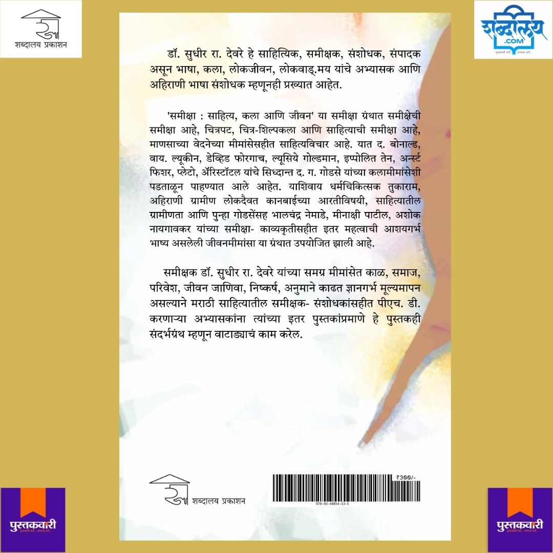 डॉ. सुधीर रा. देवरे हे साहित्यिक, समीक्षक, संशोधक, संपादक असून भाषा, कला, लोकजीवन, लोकवाड्.मय यांचे अभ्यासक आणि अहिराणी भाषा संशोधक म्हणूनही प्रख्यात आहेत. ‘समीक्षा: साहित्य, कला आणि जीवन’ या समीक्षा ग्रंथात समीक्षेची समीक्षा आहे, चित्रपट, चित्र-शिल्पकला आणि साहित्याची समीक्षा आहे, माणसाच्या वेदनेच्या मीमांसेसहीत साहित्यविचार आहे. यात द. बोनाल्ड, वाय. ल्यूकीन, डेव्हिड फोरगाच, ल्यूसिये गोल्डमान, इप्पोलित तेन, अन्र्स्ट फिशर, प्लेटो, अॅरिस्टॉटल यांचे सिध्दान्त द. ग. गोडसे यांच्या कलामीमांसेशी पडताळून पाहण्यात आले आहेत. याशिवाय धर्मचिकित्सक तुकाराम, अहिराणी ग्रामीण लोकदैवत कानबाईच्या आरतीविषयी, साहित्यातील ग्रामीणता आणि पुन्हा गोडसेंसह भालचंद्र नेमाडे, मीनाक्षी पाटील, अशोक नायगावकर यांच्या समीक्षा काव्यकृतीसहीत इतर महत्वाची आशयगर्भभाष्य असलेली जीवनमीमांसा या ग्रंथात उपयोजित झाली आहे. समीक्षक डॉ. सुधीर रा. देवरे यांच्या समग्र मीमांसेत काळ, समाज, परिवेश, जीवन जाणिवा, निष्कर्ष, अनुमाने काढत ज्ञानगर्भ मूल्यमापन असल्याने मराठी साहित्यातील समीक्षक- संशोधकांसहीत पीएच. डी. करणाऱ्या अभ्यासकांना त्यांच्या इतर पुस्तकांप्रमाणे हे पुस्तकही संदर्भग्रंथ म्हणून वाटाड्याचं काम करेल.
