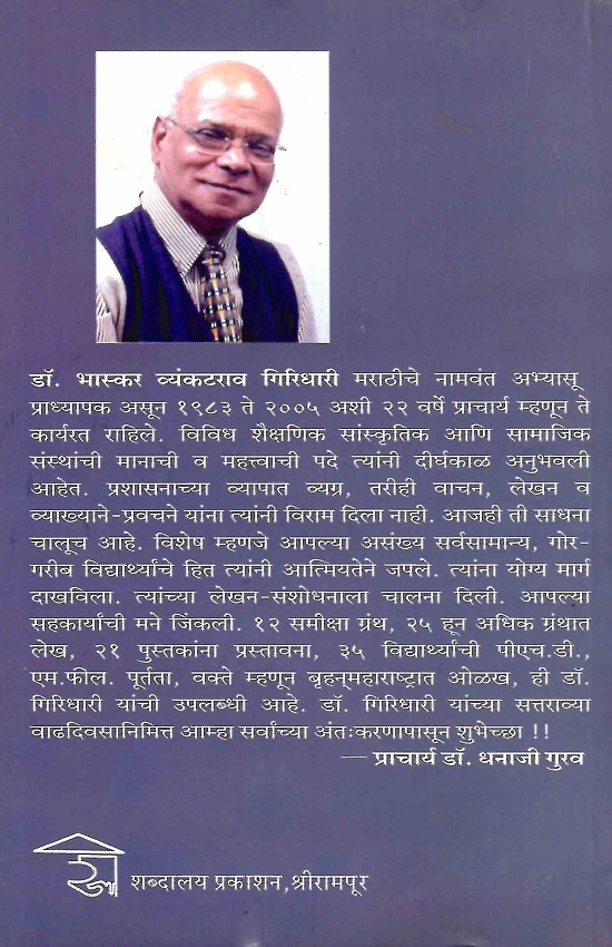 डॉ. भास्कर व्यंकटराव गिरिधारी मराठीचे नामवंत अभ्यासू प्राध्यापक असून १९८३ ते २००५ अशी २२ वर्षे प्राचार्य म्हणून कार्यरत राहिले. विविध शैक्षणिक सांस्कृतिक आणि सामाजिक संस्थांची मानाची व महत्त्वाची पदे त्यांनी दीर्घकाळ अनुभवली आहेत. प्रशासनाच्या व्यापात व्यग्र, तरीही वाचन, लेखन व व्याख्याने- प्रवचने यांना त्यांनी विराम दिला नाही. आजही ती साधना चालूच आहे. विशेष म्हणजे आपल्या असंख्य सर्वसामान्य, गोर- गरीब विद्यार्थ्यांचे हित त्यांनी आत्मियतेने जपले. त्यांना योग्य मार्ग दाखविला. त्यांच्या लेखन-संशोधनाला चालना दिली. आपल्या सहकार्यांची मने जिंकली. १२ समीक्षा ग्रंथ, २५ हून अधिक ग्रंथात लेख, २१ पुस्तकांना प्रस्तावना, ३५ विद्यार्थ्यांची पीएच.डी., एम.फील. पूर्तता, वक्ते म्हणून बृहन्महाराष्ट्रात ओळख, ही डॉ. गिरिधारी यांची उपलब्धी आहे. डॉ. गिरिधारी यांच्या सत्तराव्या वाढदिवसानिमित्त आम्हा सर्वांच्या अंतःकरणापासून शुभेच्छा !!