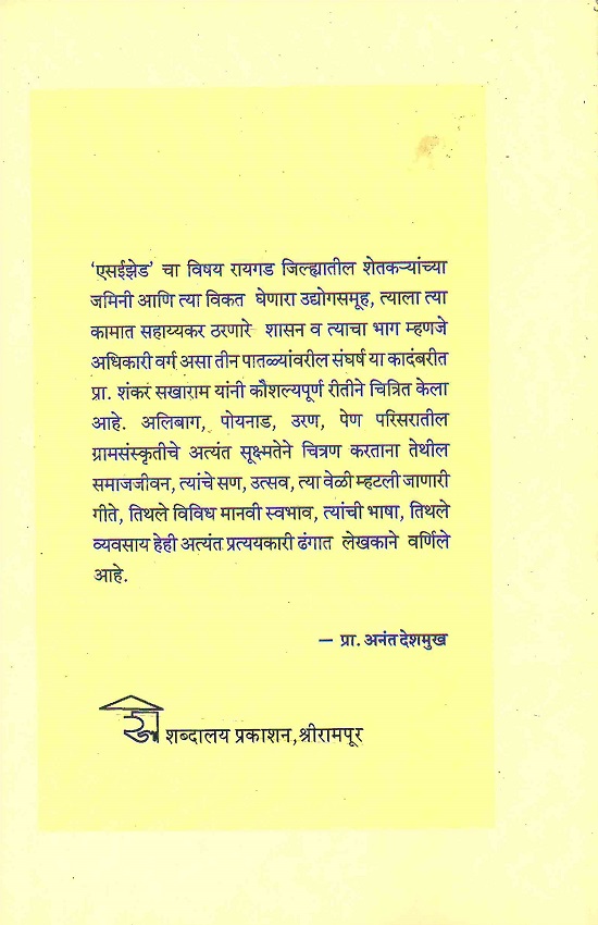 एसईझेड’ चा विषय रायगड जिल्ह्यातील शेतकऱ्यांच्या जमिनी आणि त्या विकत घेणारा उद्योगसमूह, त्याला त्या कामात सहाय्यकर ठरणारे शासन व त्याचा भाग म्हणजे अधिकारी वर्ग असा तीन पातळ्यांवरील संघर्ष या कादंबरीत प्रा. शंकर सखाराम यांनी कौशल्यपूर्ण रीतीने चित्रित केला आहे. अलिबाग, पोयनाड, उरण, पेण परिसरातील ग्रामसंस्कृतीचे अत्यंत सूक्ष्मतेने चित्रण करताना तेथील समाजजीवन, त्यांचे सण, उत्सव, त्या वेळी म्हटली जाणारी गीते, तिथले विविध मानवी स्वभाव, त्यांची भाषा, तिथले व्यवसाय हेही अत्यंत प्रत्ययकारी ढंगात लेखकाने वर्णिले आहे.