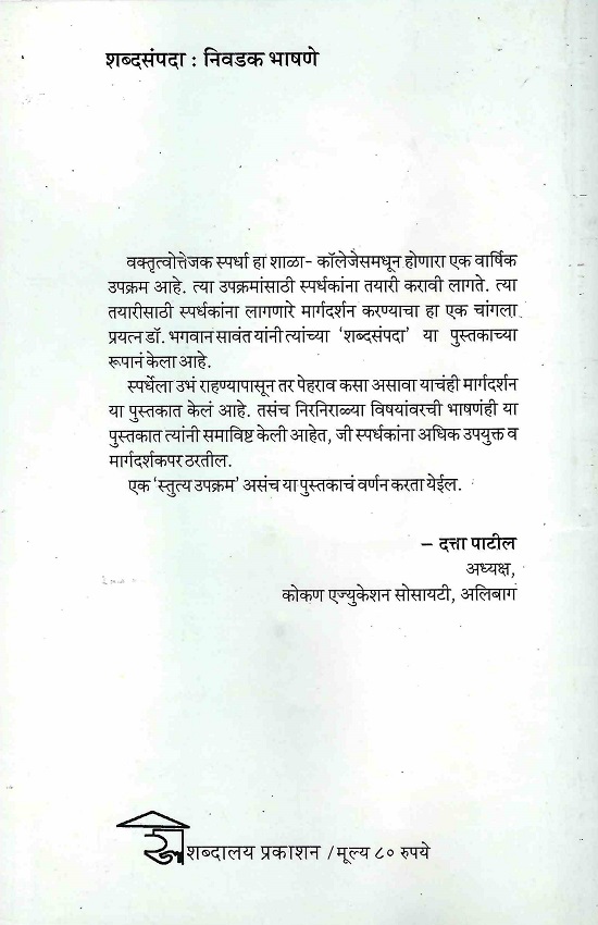 वक्तृत्वोत्तेजक स्पर्धा हा शाळा- कॉलेजेसमधून होणारा एक वार्षिक उपक्रम आहे. त्या उपक्रमांसाठी स्पर्धकांना तयारी करावी लागते. त्या तयारीसाठी स्पर्धकांना लागणारे मार्गदर्शन करण्याचा हा एक चांगला. प्रयत्न डॉ. भगवान सावंत यांनी त्यांच्या ‘शब्दसंपदा’ या पुस्तकाच्या रूपानं केला आहे. स्पर्धेला उभं राहण्यापासून तर पेहराव कसा असावा याचंही मार्गदर्शन या पुस्तकात केलं आहे. तसंच निरनिराळ्या विषयांवरची भाषणंही या पुस्तकात त्यांनी समाविष्ट केली आहेत, जी स्पर्धकांना अधिक उपयुक्त व मार्गदर्शकपर ठरतील. एक ‘ स्तुत्य उपक्रम’ असंच या पुस्तकाचं वर्णन करता येईल.
