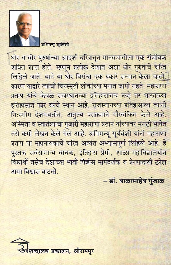 थोर व वीर पुरुषांच्या आदर्श चरित्रातून मानवजातीला एक संजीवक शक्ति प्राप्त होते. म्हणून प्रत्येक देशात अशा थोर पुरुषांचे लिहिले जाते. याने या थोर विरांचा एक प्रकारे सन्मान केला जातो. कारण याद्वारे त्यांची चिरस्मृती लोकांच्या मनात जागी राहते. महाराणा प्रताप यांचे केवळ राजस्थानच्या इतिहासातच नव्हे तर भारताच्या इतिहासात फार वरचे स्थान आहे. राजस्थानच्या इतिहासाला त्यांनी नि:स्सीम देशभक्तीने, अतुल्य पराक्रमाने गौरवांकित केले आहे. अस्मिता व स्वातंत्र्याचा पुजारी महाराणा प्रताप यांच्यावर मराठी भाषेत तसे कमी लेखन केले गेले आहे. अभिमन्यू सूर्यवंशी यांनी महाराणा प्रताप या महानायकाचे चरित्र अत्यंत अभ्यासपूर्ण लिहिले आहे. हे पुस्तक सर्वसामान्य वाचक, इतिहास प्रेमी, शाळा-महाविद्यालयीन विद्यार्थी तसेच देशाच्या भावी पिढीस मार्गदर्शक व प्रेरणादायी ठरेल असा विश्वास वाटतो.