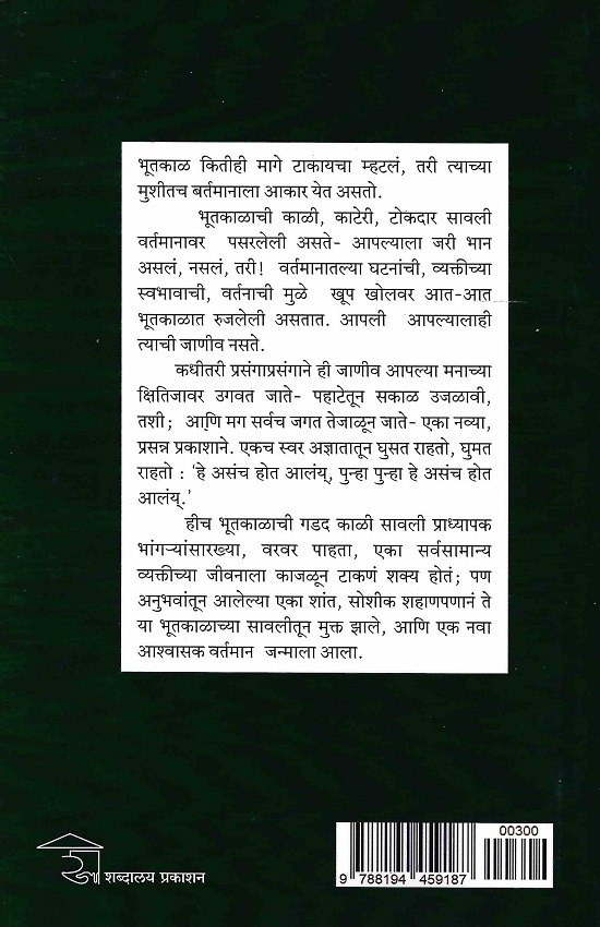 भूतकाळ कितीही मागे टाकायचा म्हटलं, तरी त्याच्या मुशीतच बर्तमानाला आकार येत असतो. भूतकाळाची काळी, काटेरी, टोकदार सावली वर्तमानावर पसरलेली असते आपल्याला जरी भान असलं नसलं, तरी! वर्तमानातल्या घटनांची, व्यक्तीच्या स्वभावाची, वर्तनाची मुळे खूप खोलवर आत-आत भूतकाळात रुजलेली असतात. आपली आपल्यालाही त्याची जाणीव नसते.कधीतरी प्रसंगाप्रसंगाने ही जाणीव आपल्या मनाच्या क्षितिजावर उगवत जाते- पहाटेतून सकाळ उजळावी, तशी ; आणि मग सर्वच जगत तेजाळून जाते- एका नव्या, प्रसन्न प्रकाशाने. एकच स्वर अज्ञातातून घुसत राहतो, घुमत राहतो : ‘हे असंच होत आलंय्, पुन्हा पुन्हा हे असंच होत आलंय्.’हीच भूतकाळाची गडद काळी सावली प्राध्यापक भांगऱ्यांसारख्या, वरवर पाहता, एका सर्वसामान्य व्यक्तीच्या जीवनाला काजळून टाकणं शक्य होतं; पण अनुभवांतून आलेल्या एका शांत, सोशीक शहाणपणानं ते या भूतकाळाच्या सावलीतून मुक्त झाले, आणि एक नवा आश्वासक वर्तमान जन्माला आला.