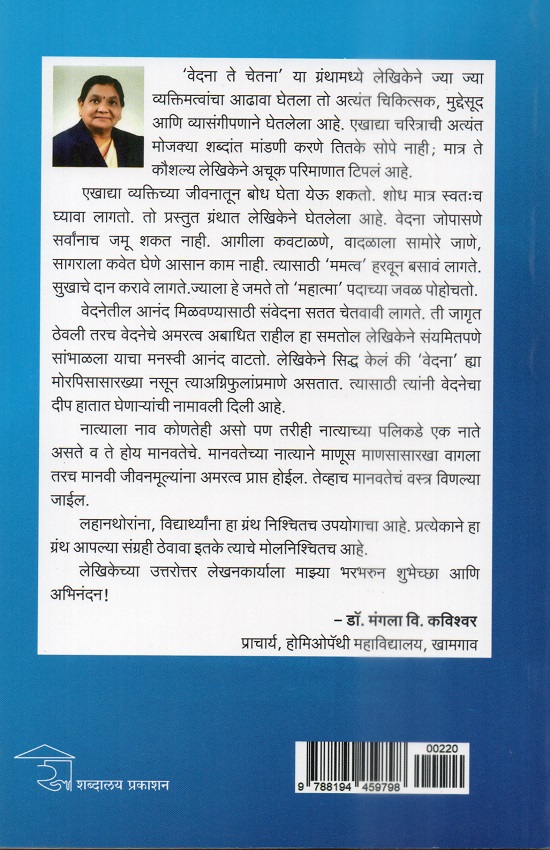 ‘वेदना ते चेतना’ या ग्रंथामध्ये लेखिकेने ज्या ज्या व्यक्तिमत्वांचा आढावा घेतला तो अत्यंत चिकित्सक, मुद्देसूद आणि व्यासंगीपणाने घेतलेला आहे. एखाद्या चरित्राची अत्यंत मोजक्या शब्दांत मांडणी करणे तितके सोपे नाही; मात्र ते कौशल्य लेखिकेने अचूक परिमाणात टिपलं आहे. एखाद्या व्यक्तिच्या जीवनातून बोध घेता येऊ शकतो. शोध मात्र स्वतःच घ्यावा लागतो. तो प्रस्तुत ग्रंथात लेखिकेने घेतलेला आहे. वेदना जोपासणे सर्वांनाच जमू शकत नाही. आगीला कवटाळणे, वादळाला सामोरे जाणे, सागराला कवेत घेणे आसान काम नाही. त्यासाठी ‘ममत्व’ हरवून बसावं लागते. सुखाचे दान करावे लागते. ज्याला हे जमते तो ‘महात्मा’ पदाच्या जवळ पोहोचतो. वेदनेतील आनंद मिळवण्यासाठी संवेदना सतत चेतवावी लागते. ती जागृत ठेवली तरच वेदनेचे अमरत्व अबाधित राहील हा समतोल लेखिकेने संयमितपणे सांभाळला याचा मनस्वी आनंद वाटतो. लेखिकेने सिद्ध केलं की ‘वेदना’ ह्या मोरपिसासारख्या नसून त्याअग्निफुलांप्रमाणे असतात. त्यासाठी त्यांनी वेदनेचा दीप हातात घेणाऱ्यांची नामावली दिली आहे. नात्याला नाव कोणतेही असो पण तरीही नात्याच्या पलिकडे एक नाते असते व ते होय मानवतेचे मानवतेच्या नात्याने माणूस माणसासारखा वागला तरच मानवी जीवनमूल्यांना अमरत्व प्राप्त होईल. तेव्हाच मानवतेचं वस्त्र विणल्या जाईल. लहानथोरांना, विद्यार्थ्यांना हा ग्रंथ निश्चितच उपयोगाचा आहे. प्रत्येकाने हा ग्रंथ आपल्या संग्रही ठेवावा इतके त्याचे मोलनिश्चितच आहे. लेखिकेच्या उत्तरोत्तर लेखनकार्याला माझ्या भरभरून शुभेच्छा आणि अभिनंदन ! – डॉ. मंगला वि. कविश्वरप्राचार्य, होमिओपॅथी महाविद्यालय,खामगाव